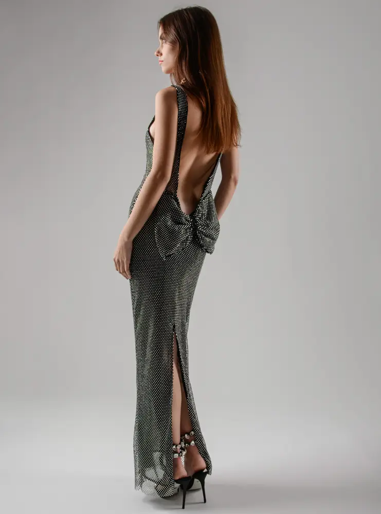 Sparkling stretch black mesh dress studded with Swarovski crystals entirely hand mad with a sensual open back design.